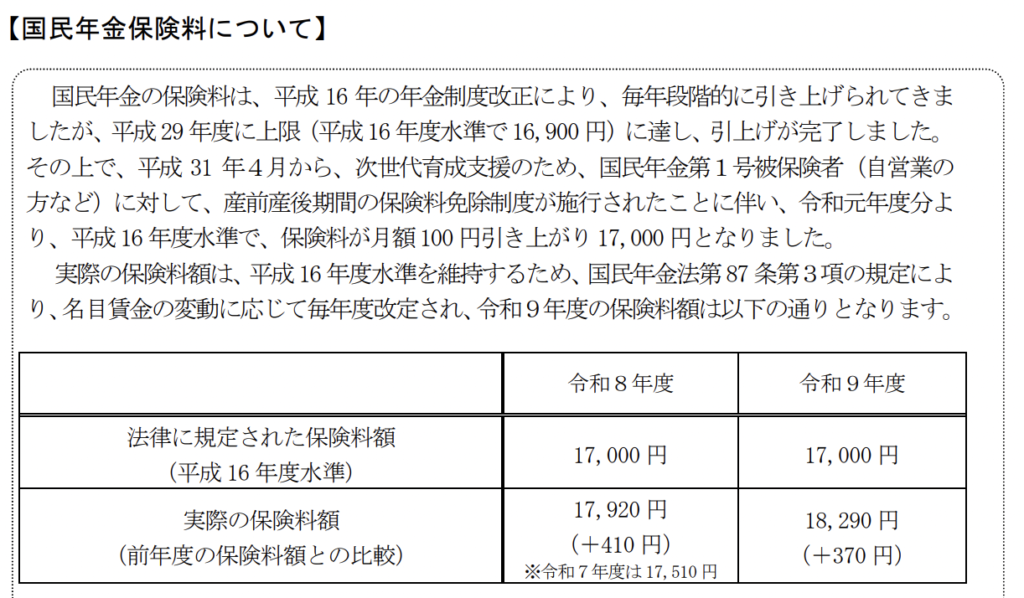 令和8年度の年金保険料は月額17,920円で、令和7年度と比べ410円も増額してしまいます。月額で書かれているので少額に感じるかもしれませんが、年額にすると増え幅はなんと4,920円・・・! 年額で5,000円近く納付額が増えてしまうことになります。